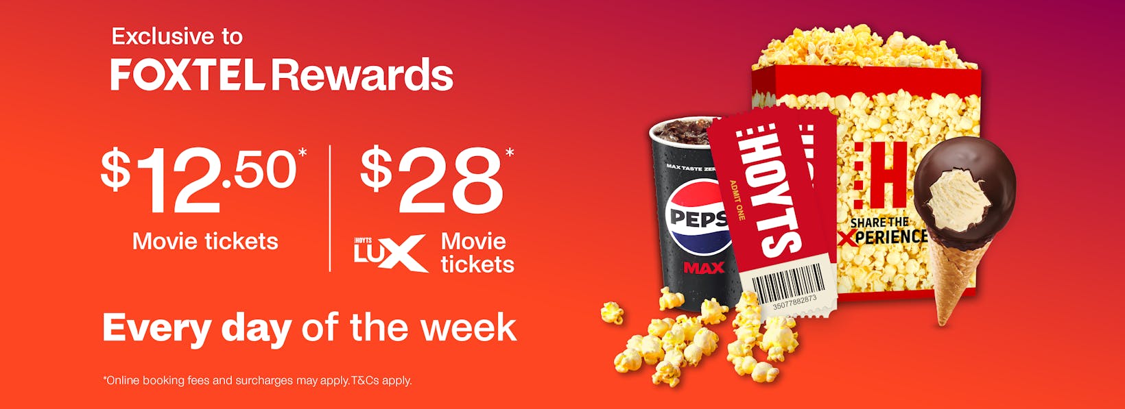 Foxtel Rewards members can access standard adult HOYTS movie tickets at $12.50 per ticket and HOYTS LUX tickets at $28 per ticket every day of the week. There is a limit of 6 tickets per Foxtel Rewards member per day on either offer.