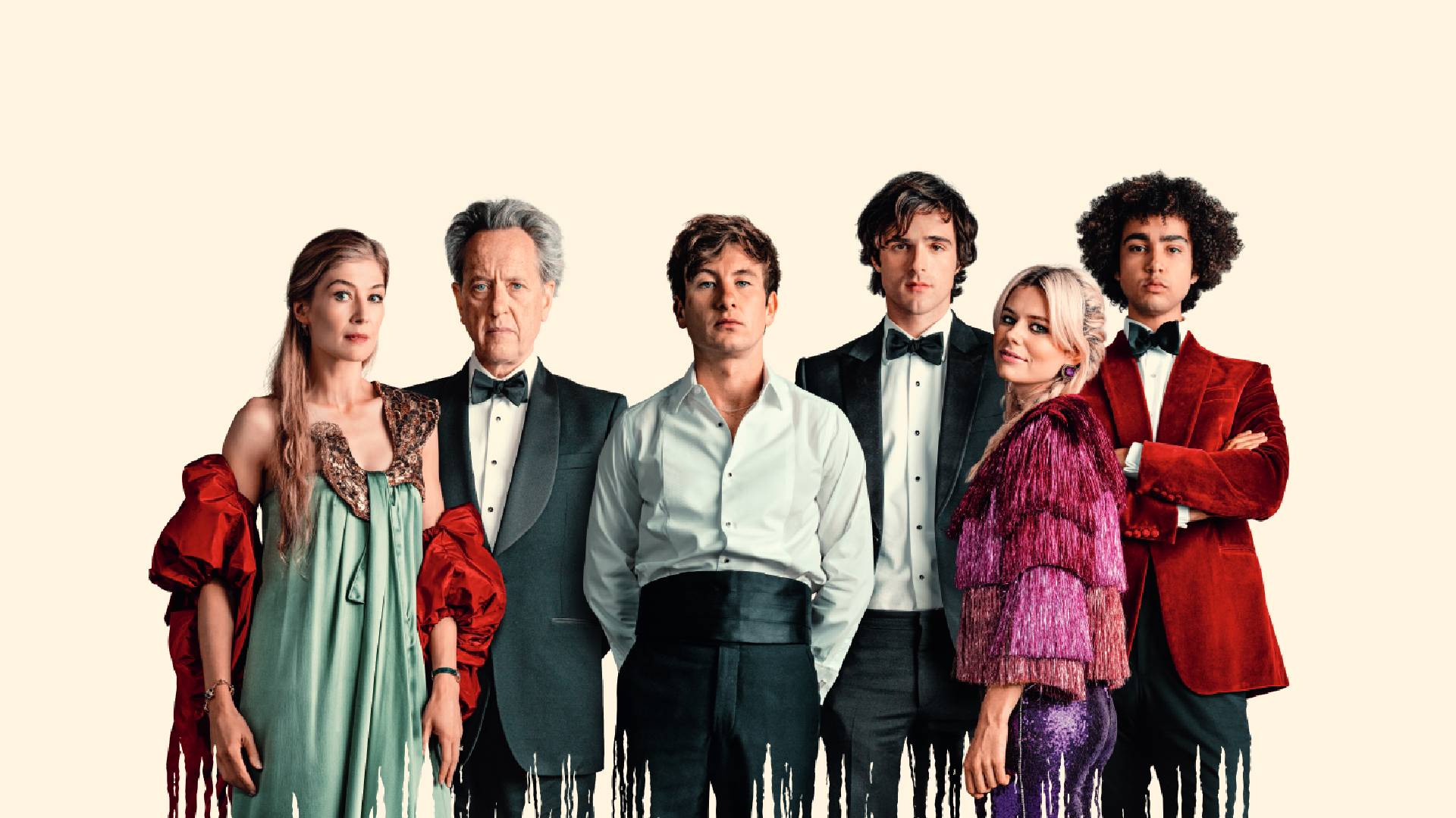 - Carey Mulligan, Rosamund Pike, Barry Keoghan, Richard E. Grant, Archie Madekwe, Jacob Elordi, Alison Oliver